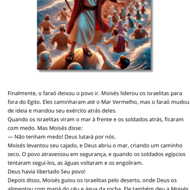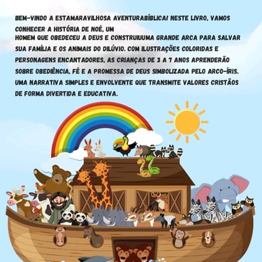 Noé obedeceu a Deus e construiu uma grande arca. Nela entraram sua família e os animais, dois a dois. Choveu por 40 dias, mas todos ficaram seguros dentro da arca. Depois, Deus colocou o arco-íris no céu como promessa de amor e cuidado pela humanidade.